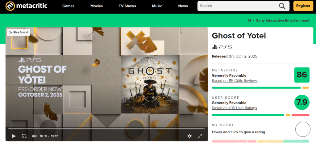 10月2日に発売した『Ghost of Yōtei』を購入し7時間弱ほどプレイしてみたので、メタスコアの評価と、併せて自分の印象も少し書いていこうかなと思います。