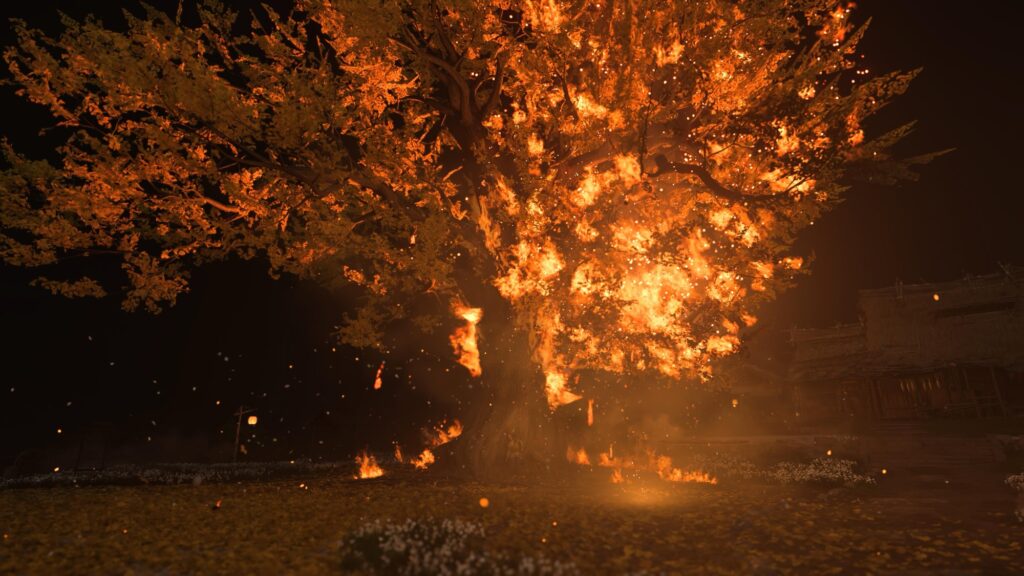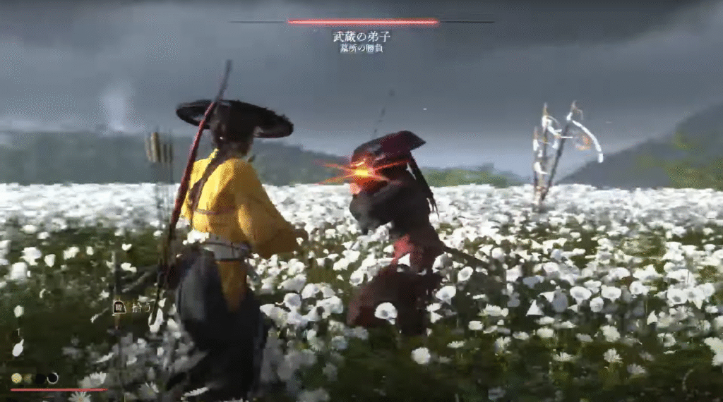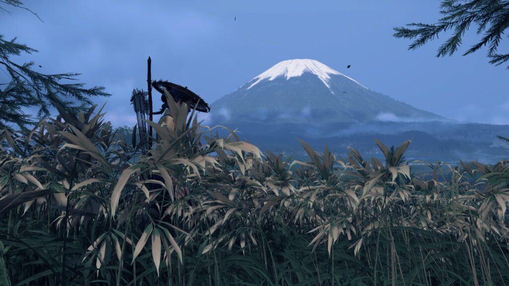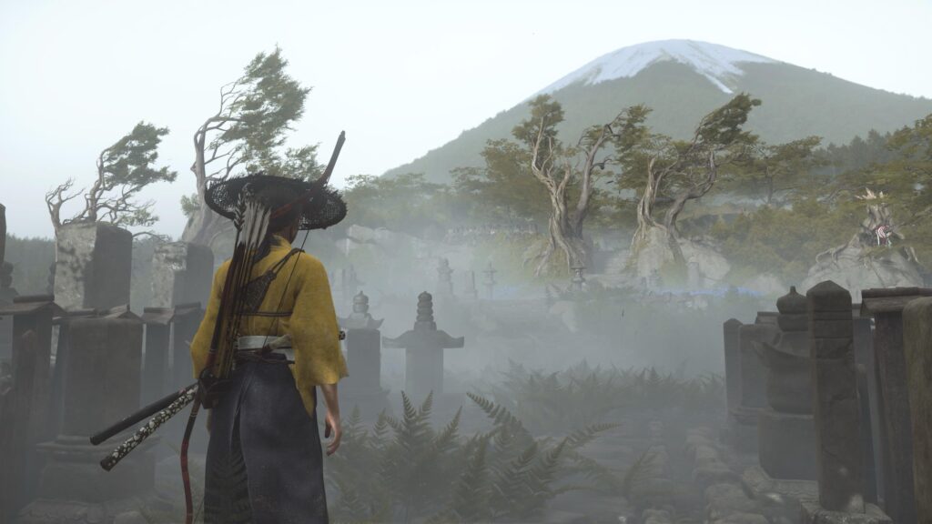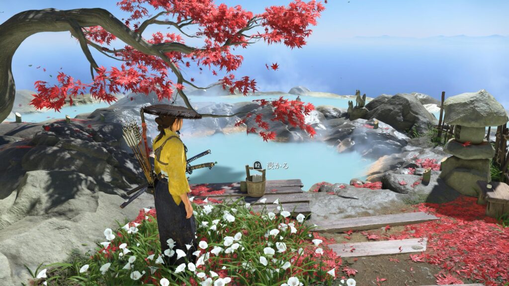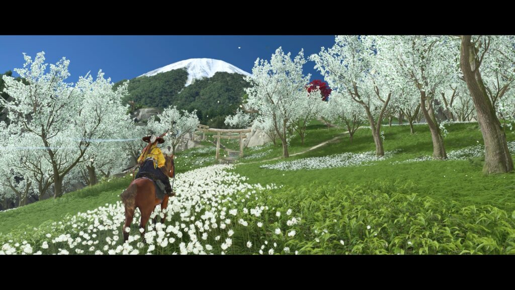 まだ序盤のエリアですが、現時点でもかなり色彩豊かで様々な風景を楽しむ事ができ、風にそよぐ草木や舞う花ビラなどの動的な演出は、馬に乗って走り回っているだけでも景色の綺麗さに圧倒されます。前作の『Ghost of Tsushima』でも同様に風景の豊かさなどは高いクオリティで表現されていましたが、オブジェクトなどの書き込みはやや粗くなっていました。しかし今作ではPS5によりマシンスペックが向上したおかげか、細かな部分も精細に書き込まれている印象です。勿論より綺麗なグラフィックのゲームは存在すると思いますが、本作の臨場感を味わうには十分なクオリティに感じられます。